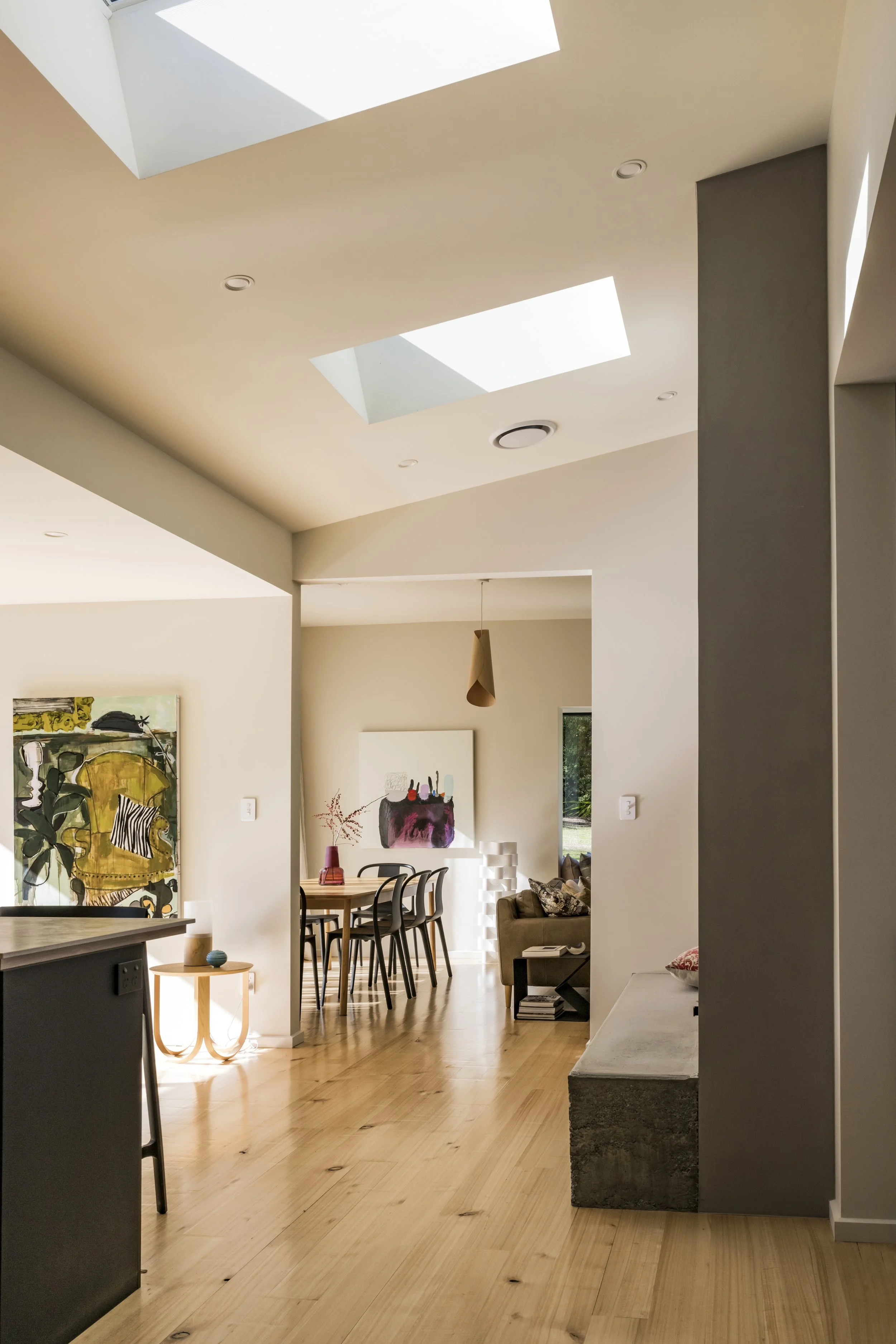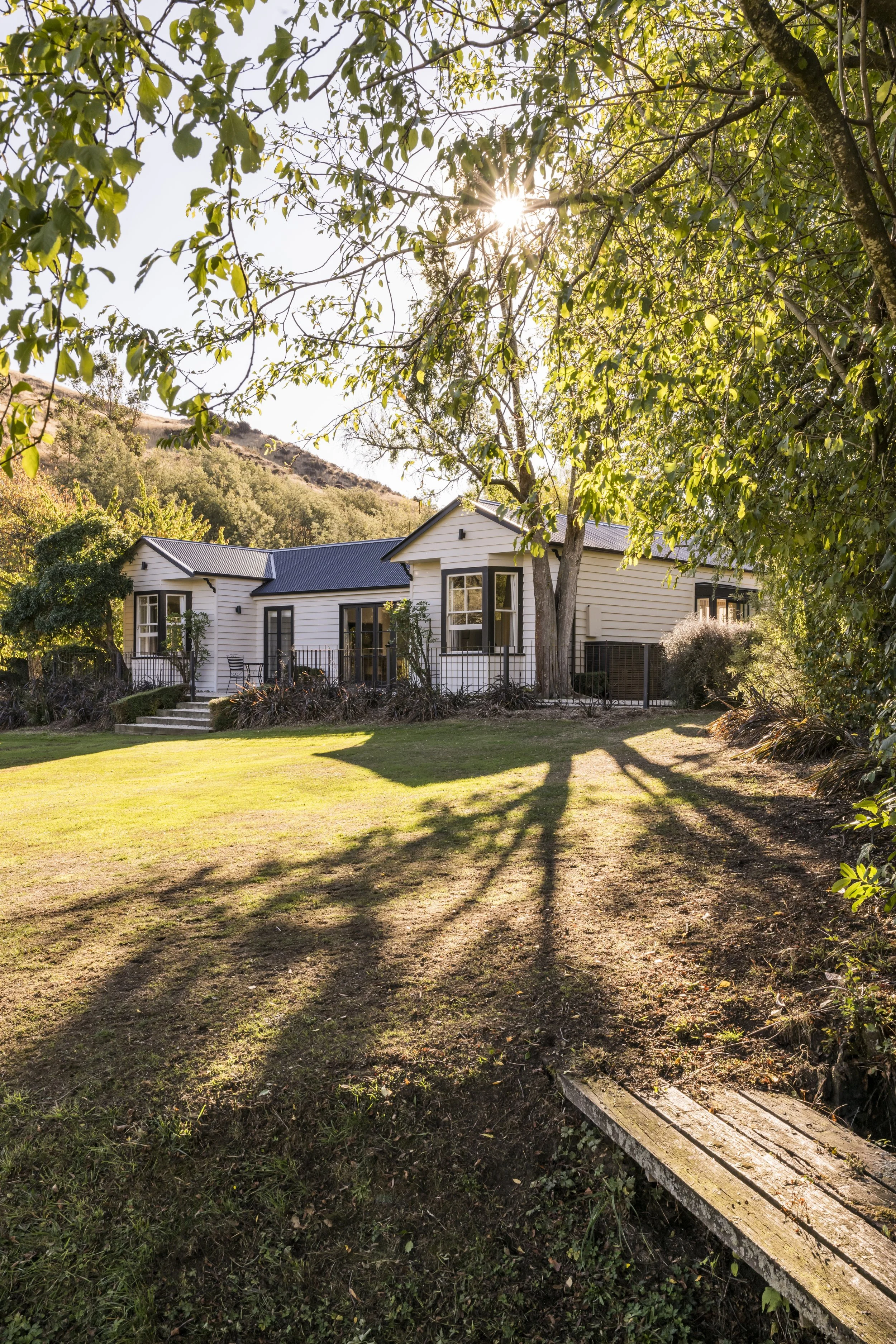 The interior of the villa has been thoughtfully reimagined to create a seamless fusion of heritage and contemporary design. The removal of the original low ceiling in the kitchen area allowed for a dramatic transformation—introducing volume, natural light, and a sense of grandeur that contrasts yet complements the traditional villa layout. The new ‘black box’ addition houses a generous open-plan kitchen and formal entry, defined by clean lines, skylights, and expansive glazing that frames views of the surrounding Greta Valley. Internally, original features such as wooden doors, windows, and the freestanding bath were meticulously restored and reintegrated, preserving the home’s character while enhancing its functionality. The cantilevered bay window seat adds a playful yet practical touch, offering a light-filled nook for reflection and connection to the established gardens. Every interior element was carefully considered, resulting in a space that feels both grounded in history and tailored for modern living.