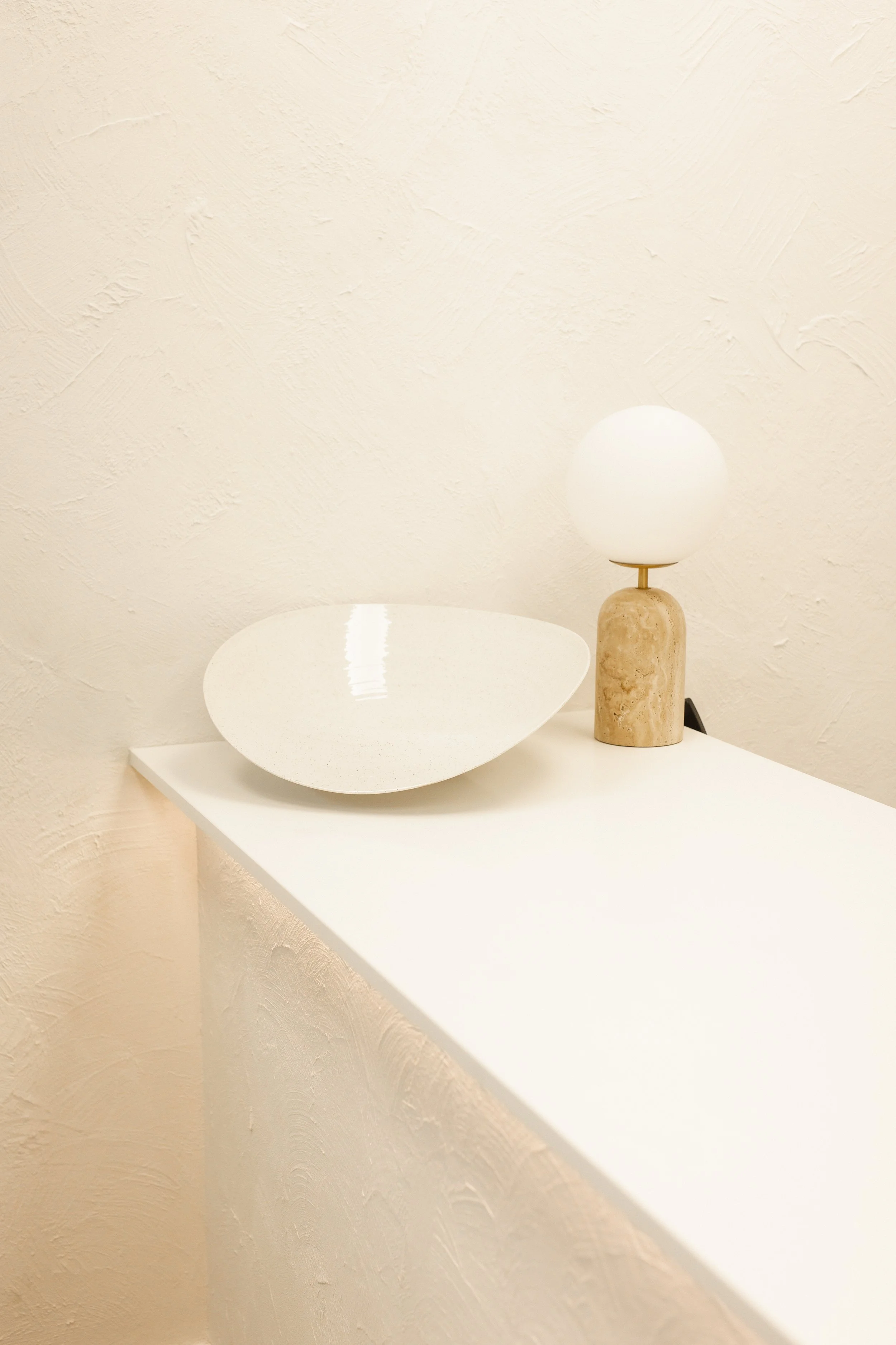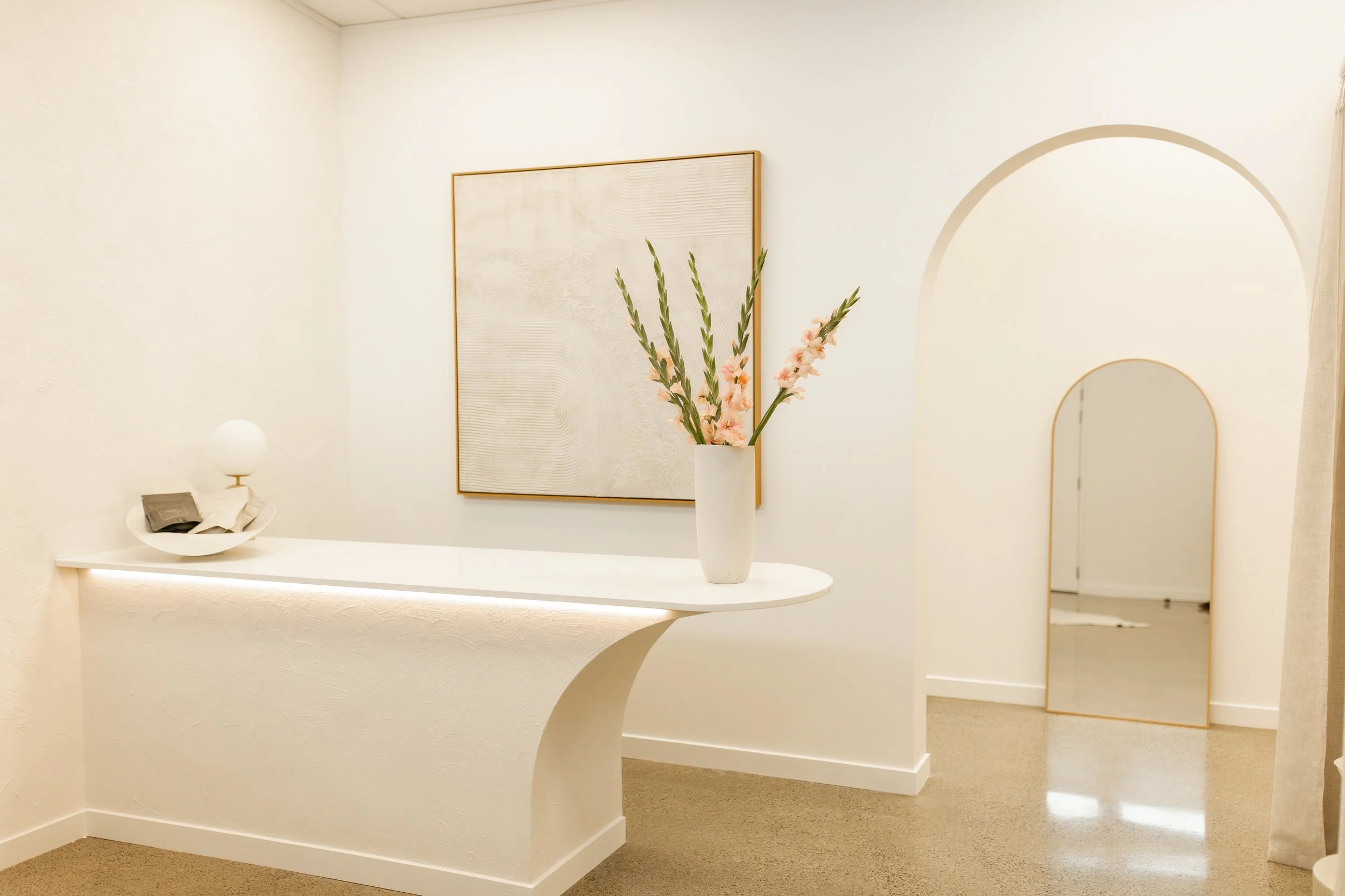 The interior showcases a warm, minimalist palette with layered neutrals and soft textures. Polished plaster walls, natural timber accents, and plush upholstered seating bring a tactile richness to the space. Statement floral arrangements and art pieces add elegance and visual interest without overwhelming the calm aesthetic. Together, these elements create a restorative, welcoming environment that feels elevated yet grounded — an ideal sanctuary for self-care and beauty.