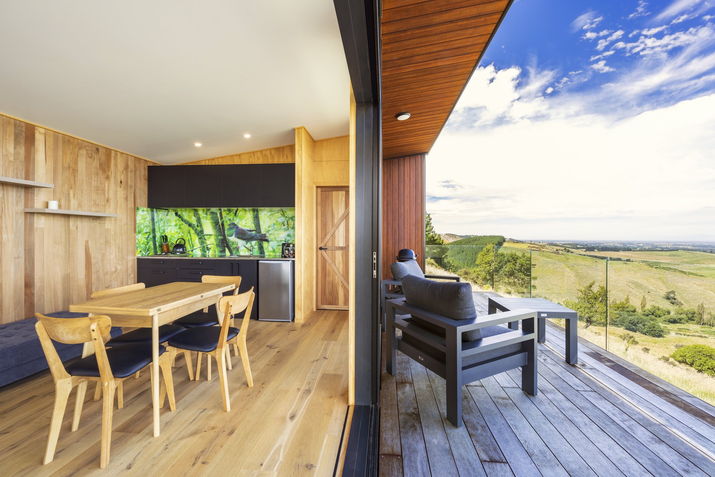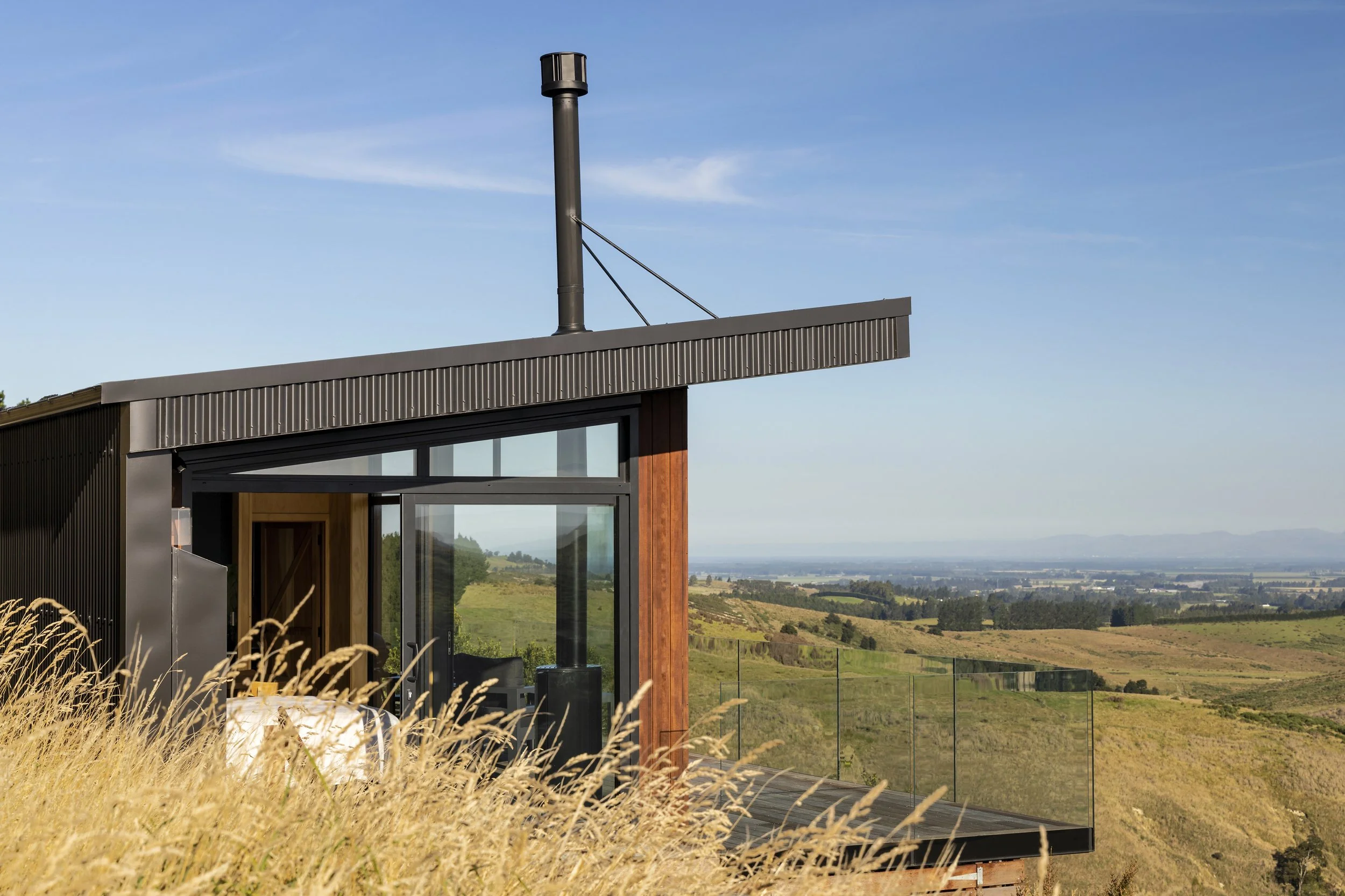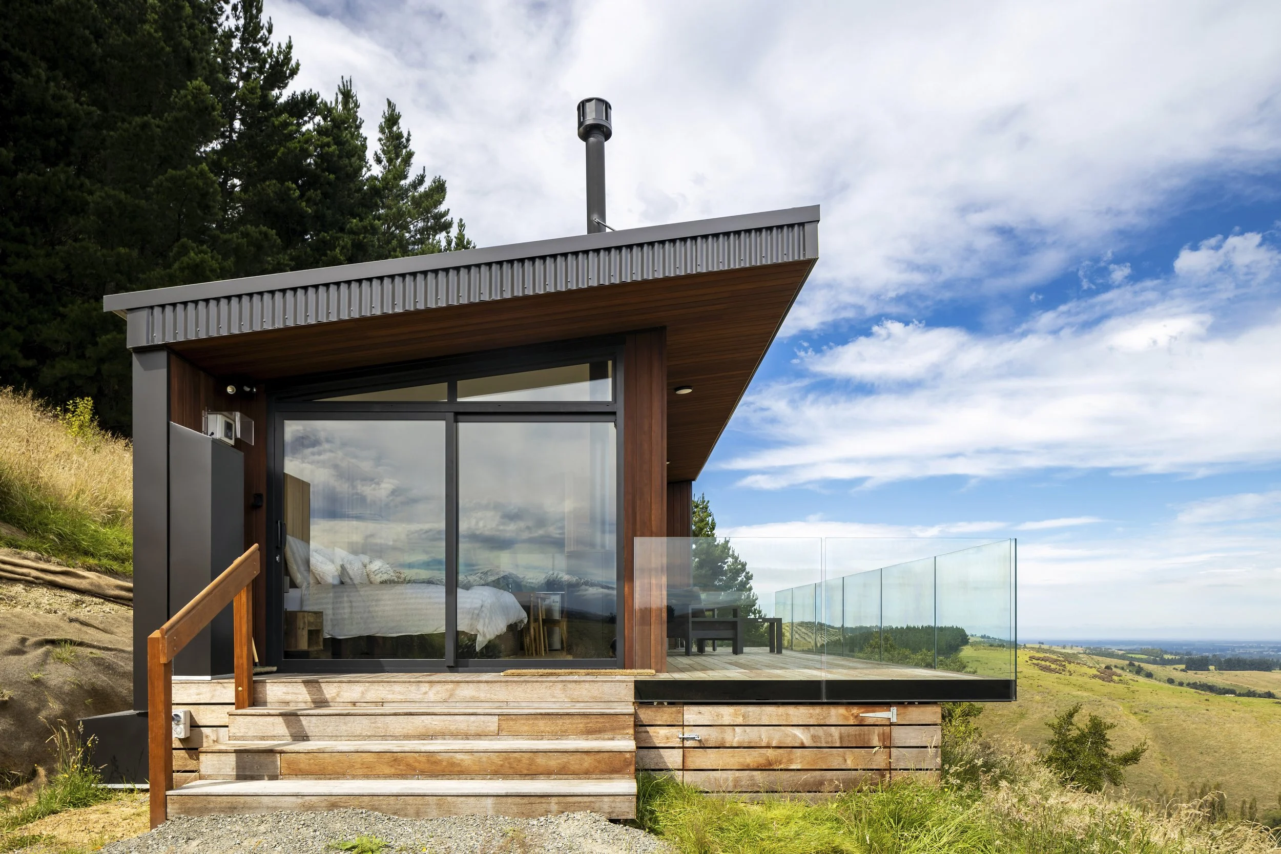 Inside, the dwelling offers a modest yet functional layout split between two rooms—a multi-use space that serves as kitchen, living, and sleeping quarters, and a separate bathroom. The interior is compact and efficient, designed to connect seamlessly with the outdoors through clerestory windows and a frameless glass balustrade, offering uninterrupted views of the Canterbury plains while maintaining shelter from the hillside’s prevailing winds.
