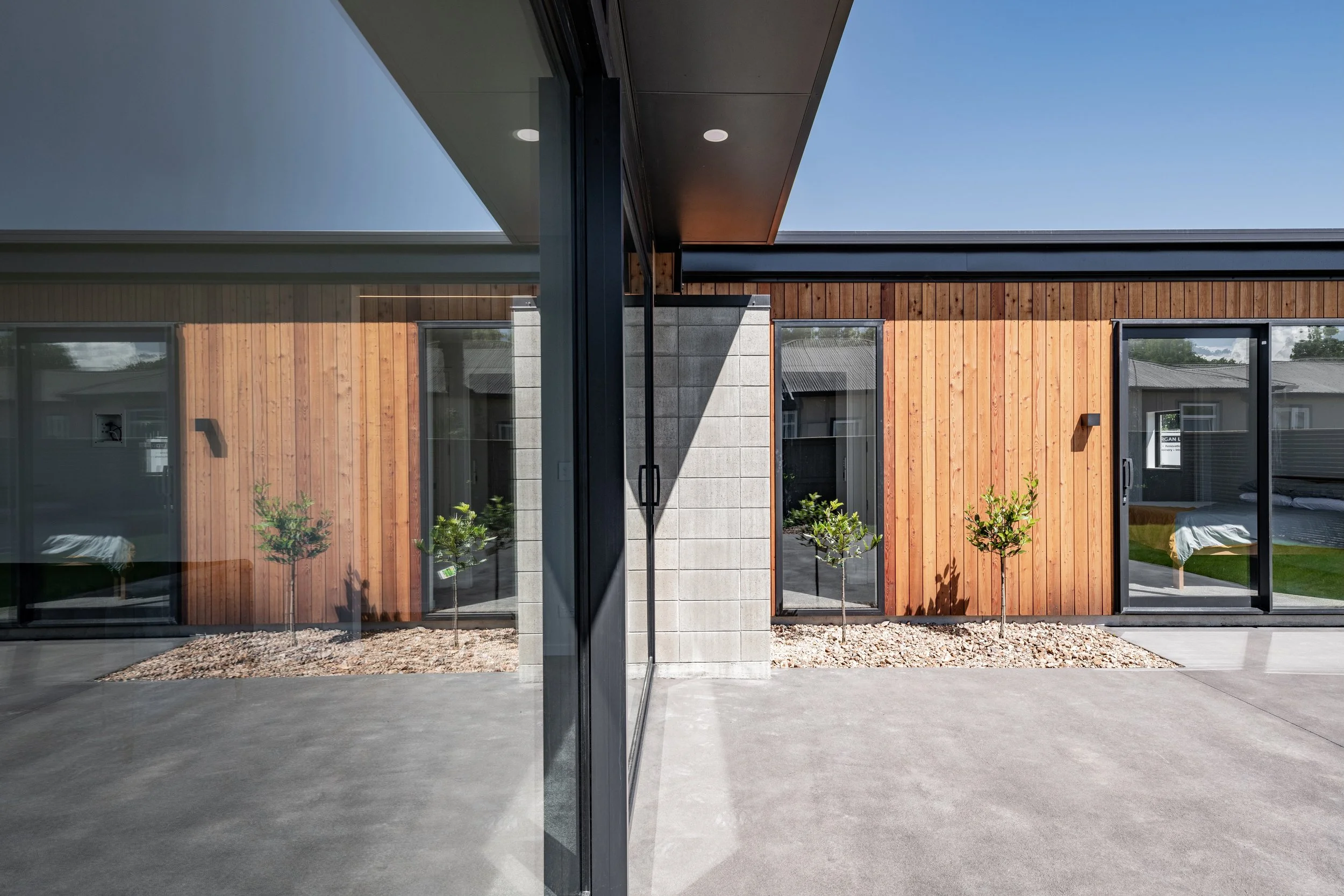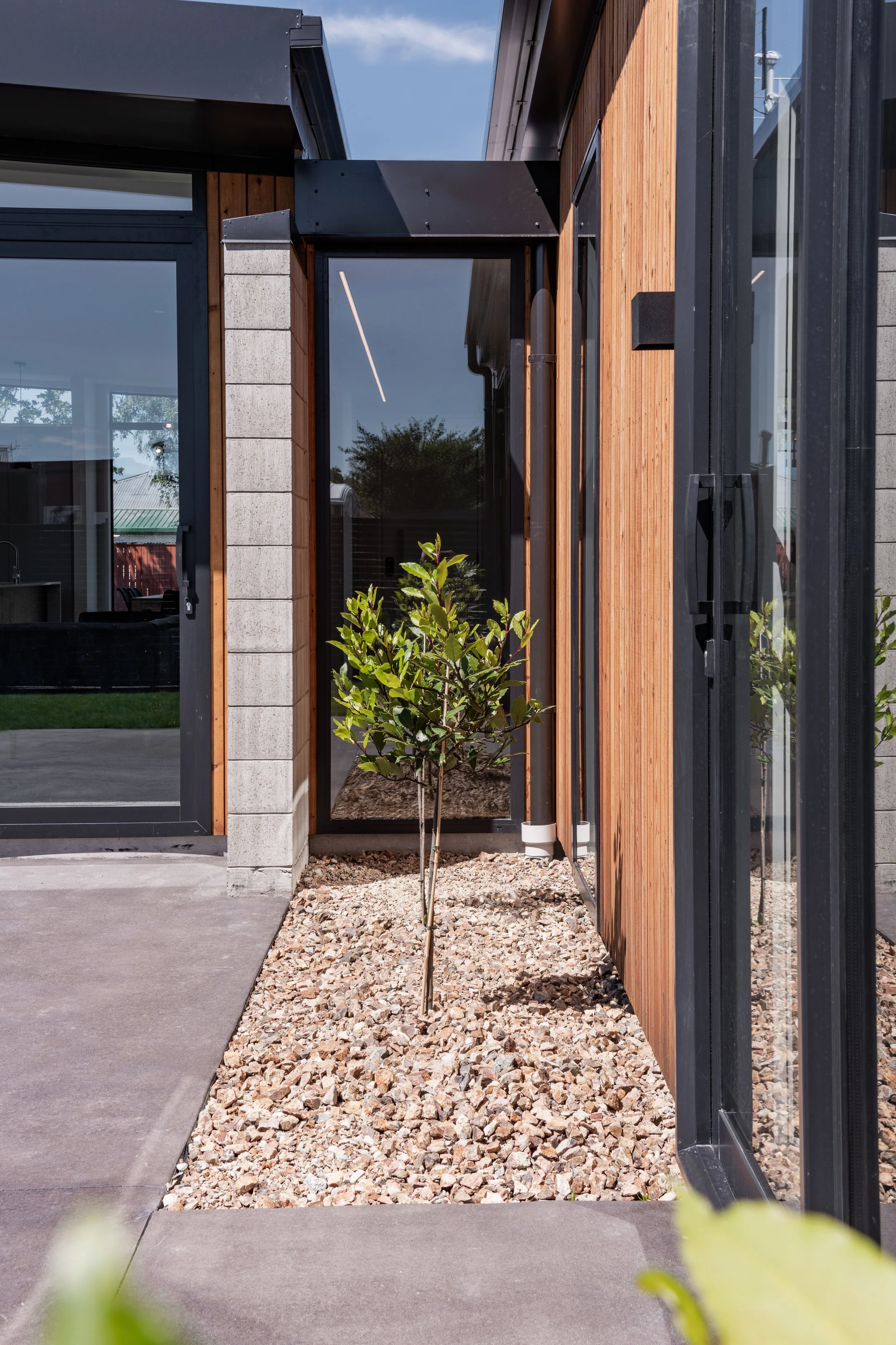 Archco has made clever use of volume, orientation, and materials to ensure privacy without sacrificing openness. The home’s layout wraps around a central outdoor area, creating a private courtyard feel while allowing natural light to pour in from multiple angles. Creative use of vertical timber slats and in-situ concrete adds texture and architectural rhythm. Sliding glass doors and large windows blend inside and out seamlessly, creating flow and visual connection throughout the home.