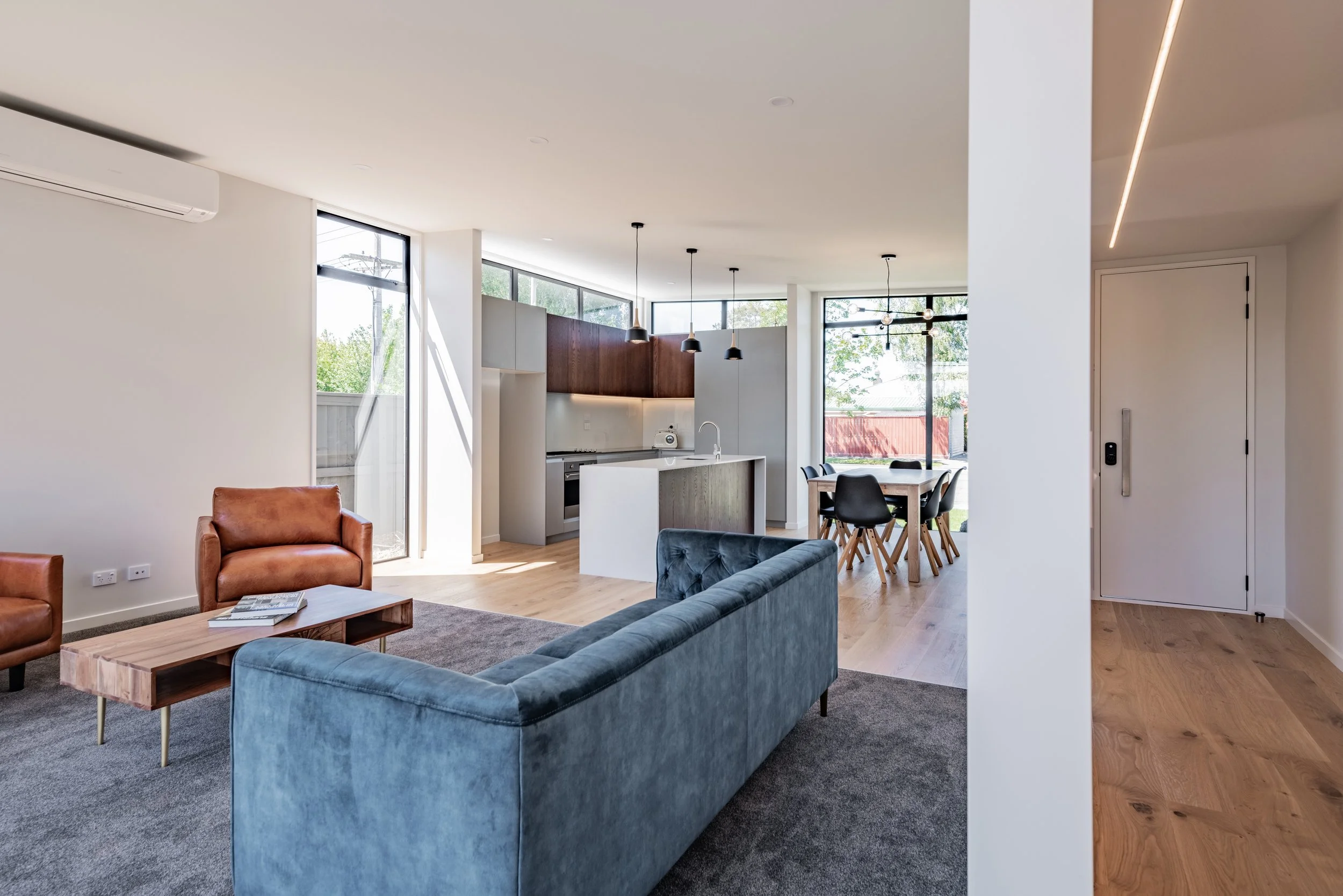 The interior is grounded in simplicity, with a restrained palette of light walls, timber floors, and black fittings that echo the exterior detailing. Spaces feel generous and open, thanks to high ceilings, smart spatial planning, and wide openings to the outdoors. The kitchen is minimalist yet welcoming, acting as the heart of the home, with views extending straight through to the living and dining areas. Furniture choices lean soft and inviting — plush sofas, timber dining tables, and modern lighting all contribute to the home’s cohesive, calm atmosphere.